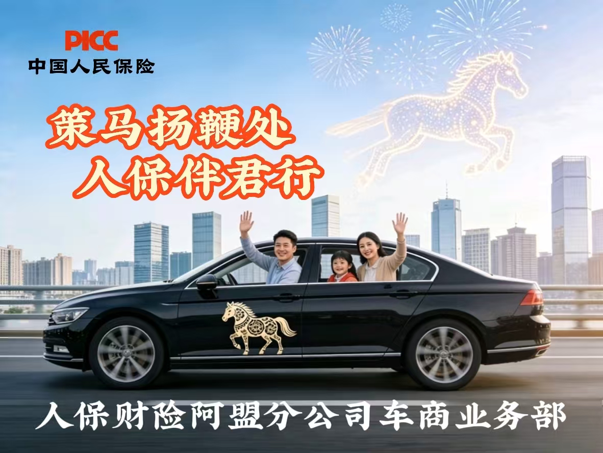 金马贺岁,瑞气盈门。值此2026年丙午马年新春来临之际,人保财险阿盟分公司车商业务部向每一位在路上的您,致以最诚挚的平安祝福。当您驾驶爱车,满载思念奔赴团圆,人保财险不仅是您旅途的见证者,更是全程随行的“风险管家”,用专业与温情守护每一程。